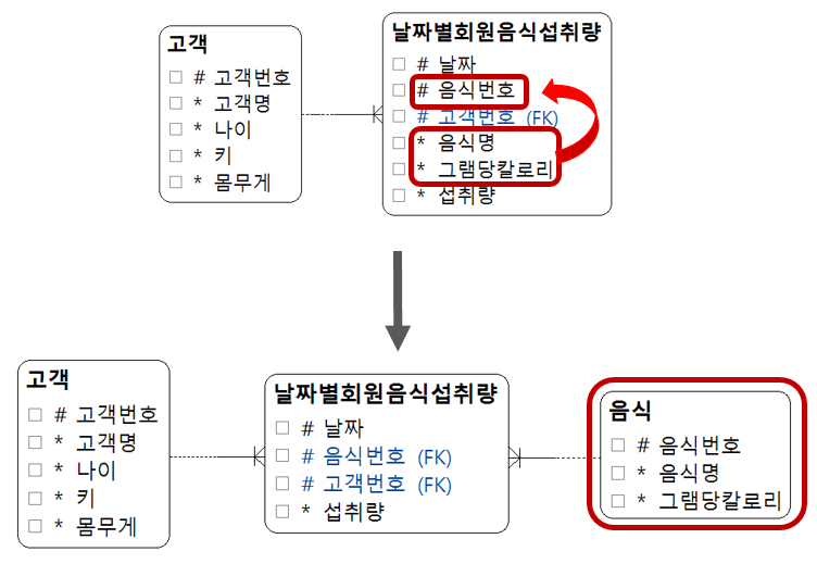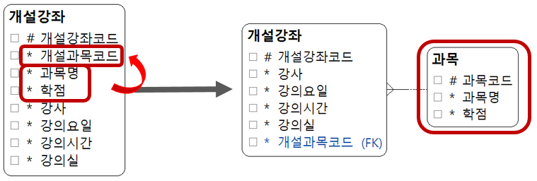 - 일반 속성에 결정자 속성과 종속자 속성이 있는 경우 다른 엔터티로 구별하여 분리한다.