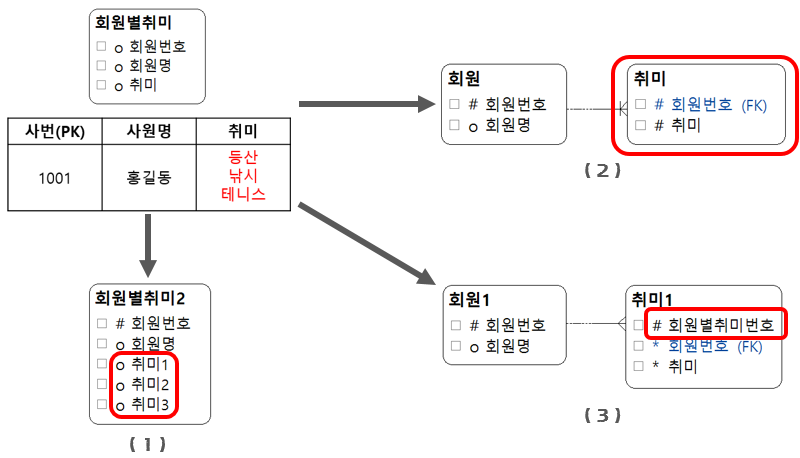 - (2)와 같이 엔터티를 따로 추출해서 1대 다 관계로 처리할 수 있다. 새로 생성된 엔터티의 인스턴스들을 구분하기 위해 속성들을 모두 식별자(복합키)로 활용하는 경우이다. (인스턴스의 구분 기준을 고려하여 식별자를 선정한다.)