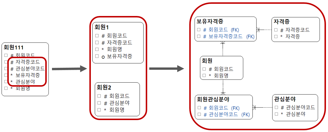 - 보유자격증과 관심분야는 각각 다가 속성이면서 서로 관련이 없으므로 엔터티를 분리한다.