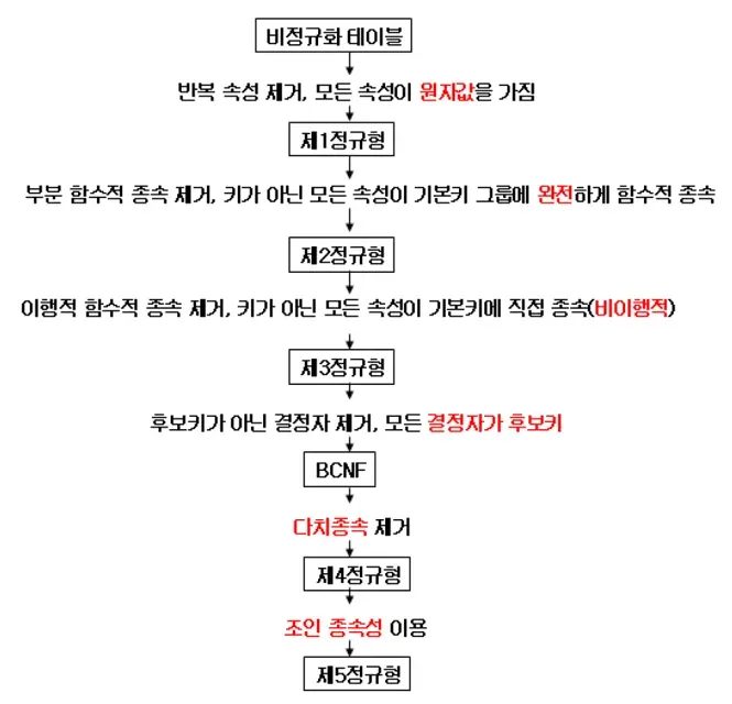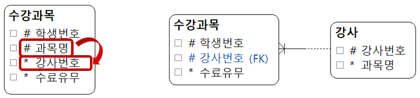 - 후보 식별자 속성과 일반 속성 간의 종속성을 판단하여 처리한다.