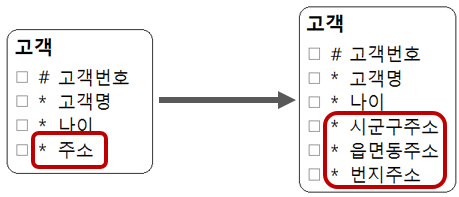 - 주소라는 속성은 여러 속성이 하나로 묶인 복합속성의 의미가 될 수 있다.